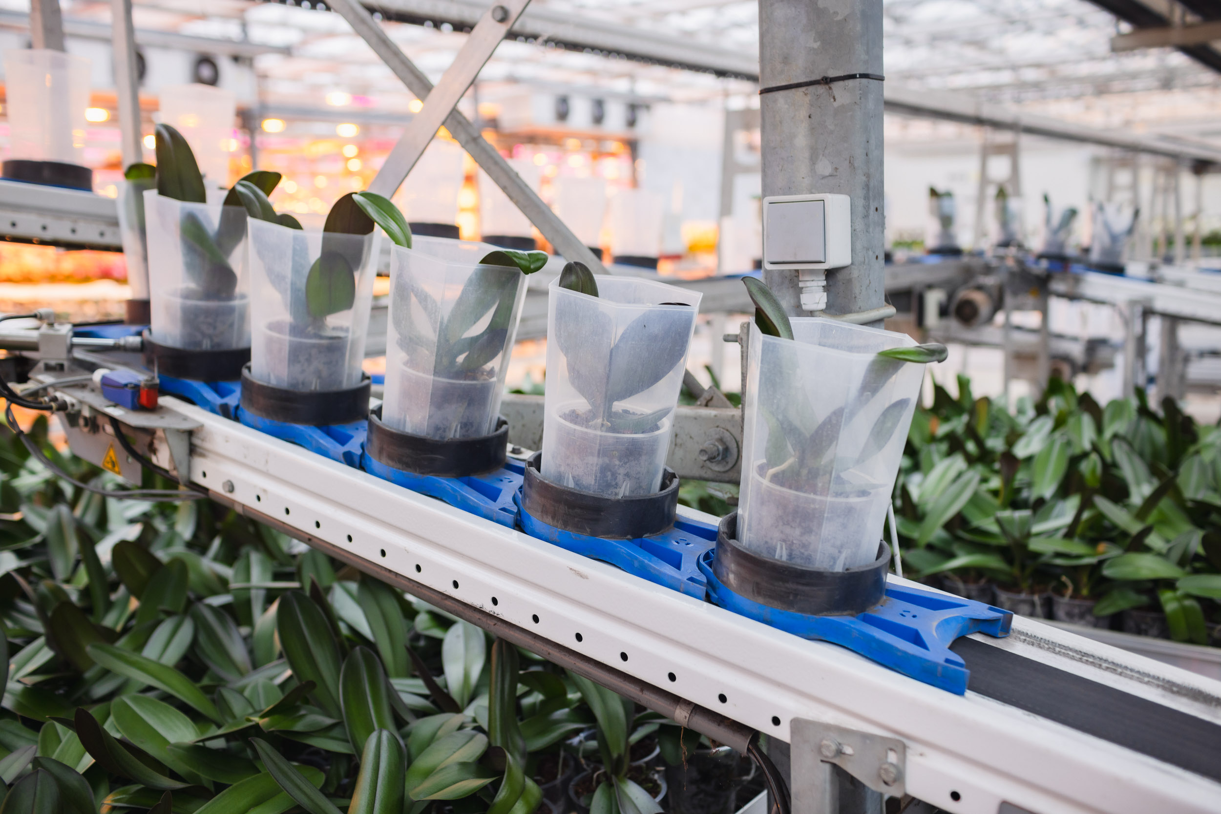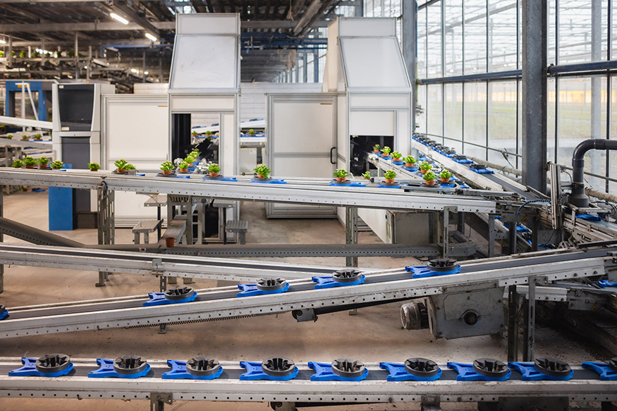 The OPD cleaner is an integrated component of the Plant Order System that supports a closed-loop logistics process. Empty Oval Plant Carriers released after processing are automatically transported to the cleaning station.