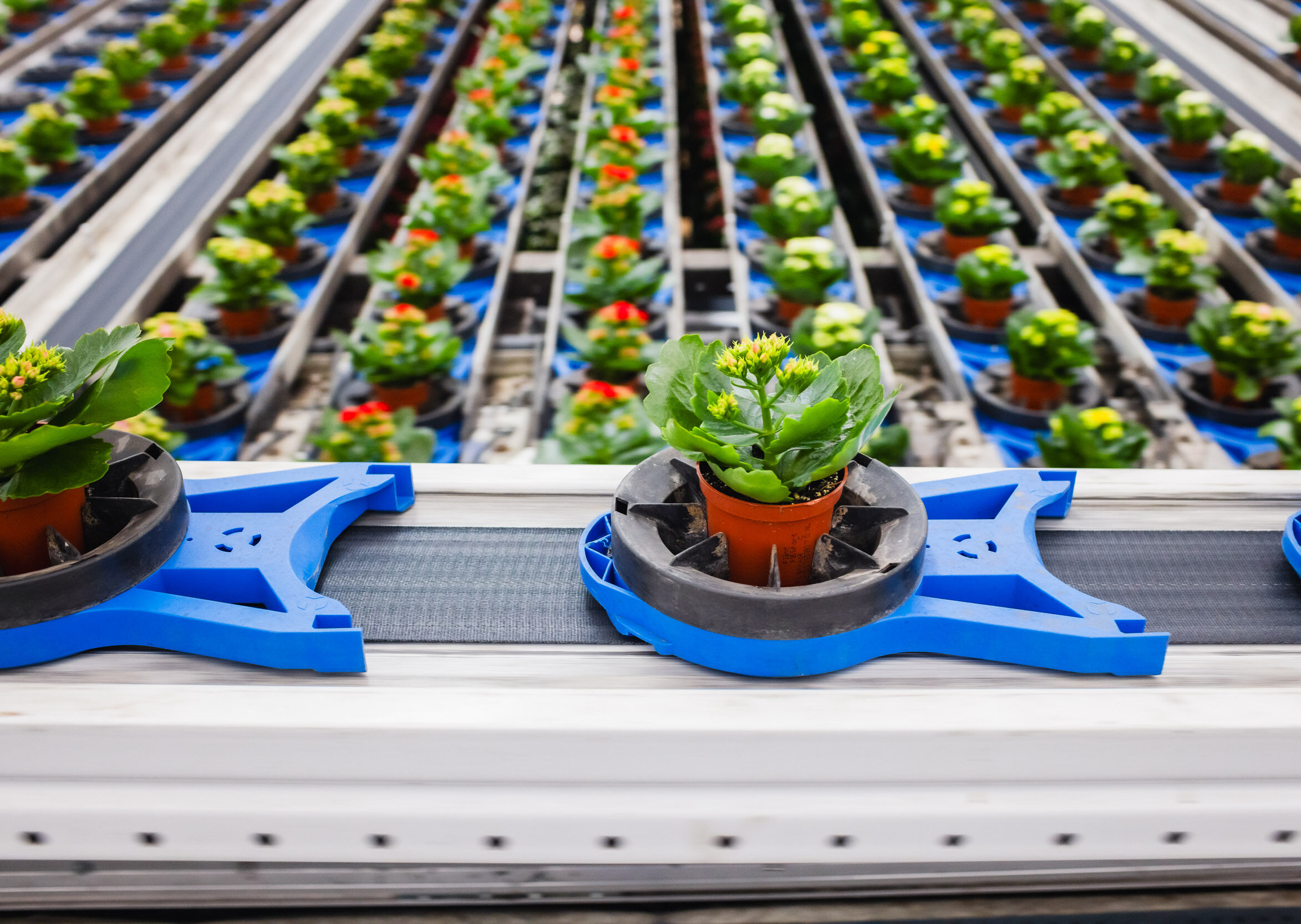 An integrated lifting mechanism separates the carrier from the conveyor belt, reducing friction and wear. Inserts are available in various sizes to match different pot dimensions, making the carrier flexible across crops and cultivation types.