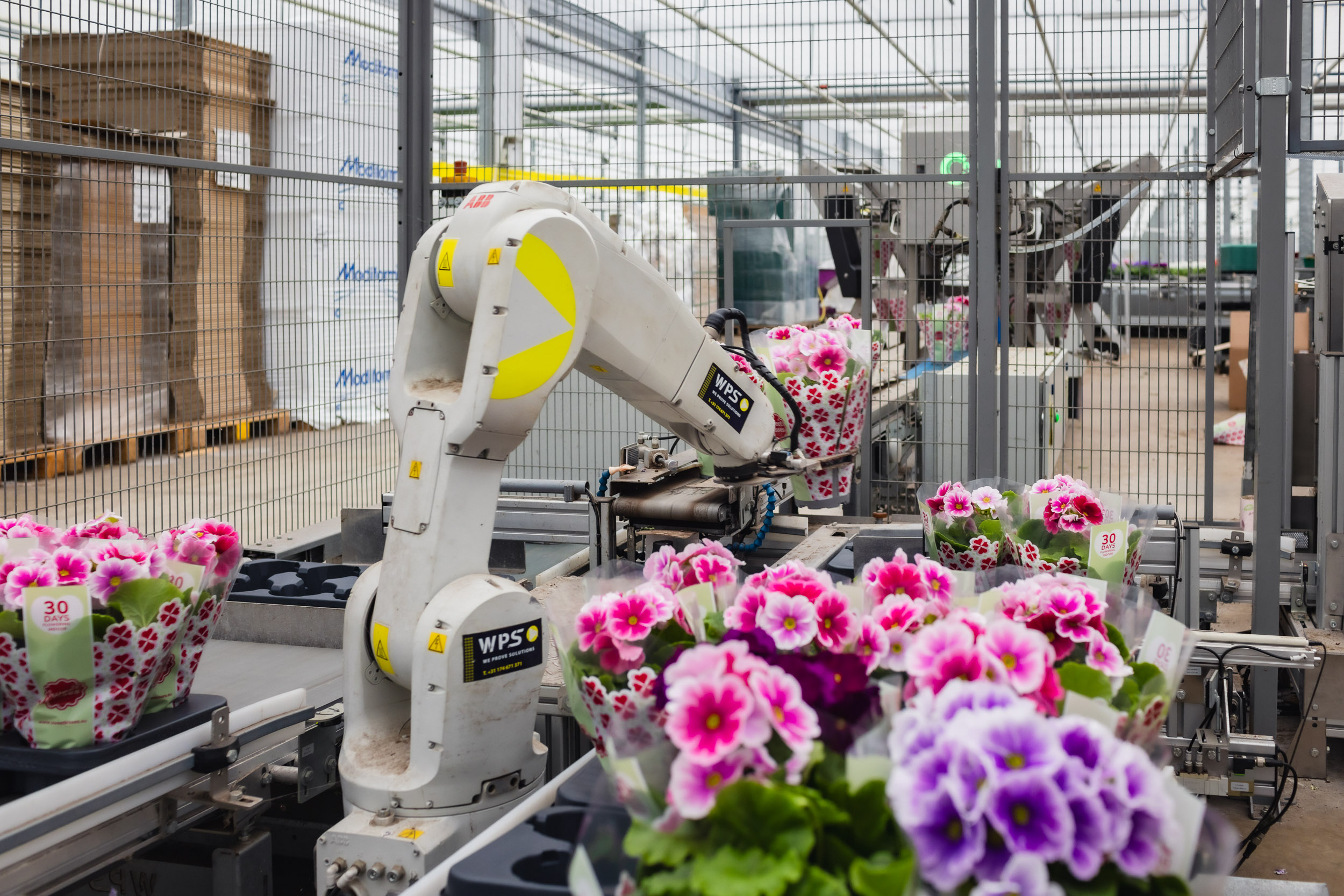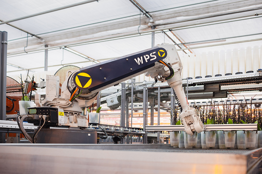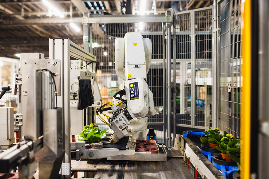 Robot arms can be used across cultivation and order processing. Plants can be picked up and placed into carriers, moved from carriers into trays, or positioned on benches and tables.