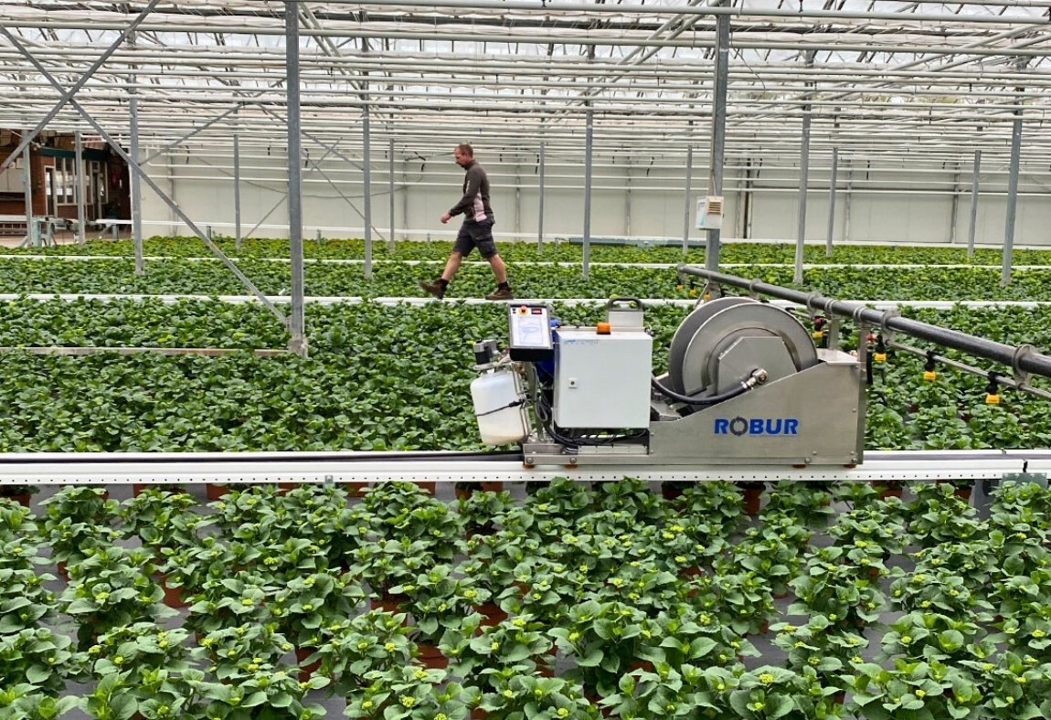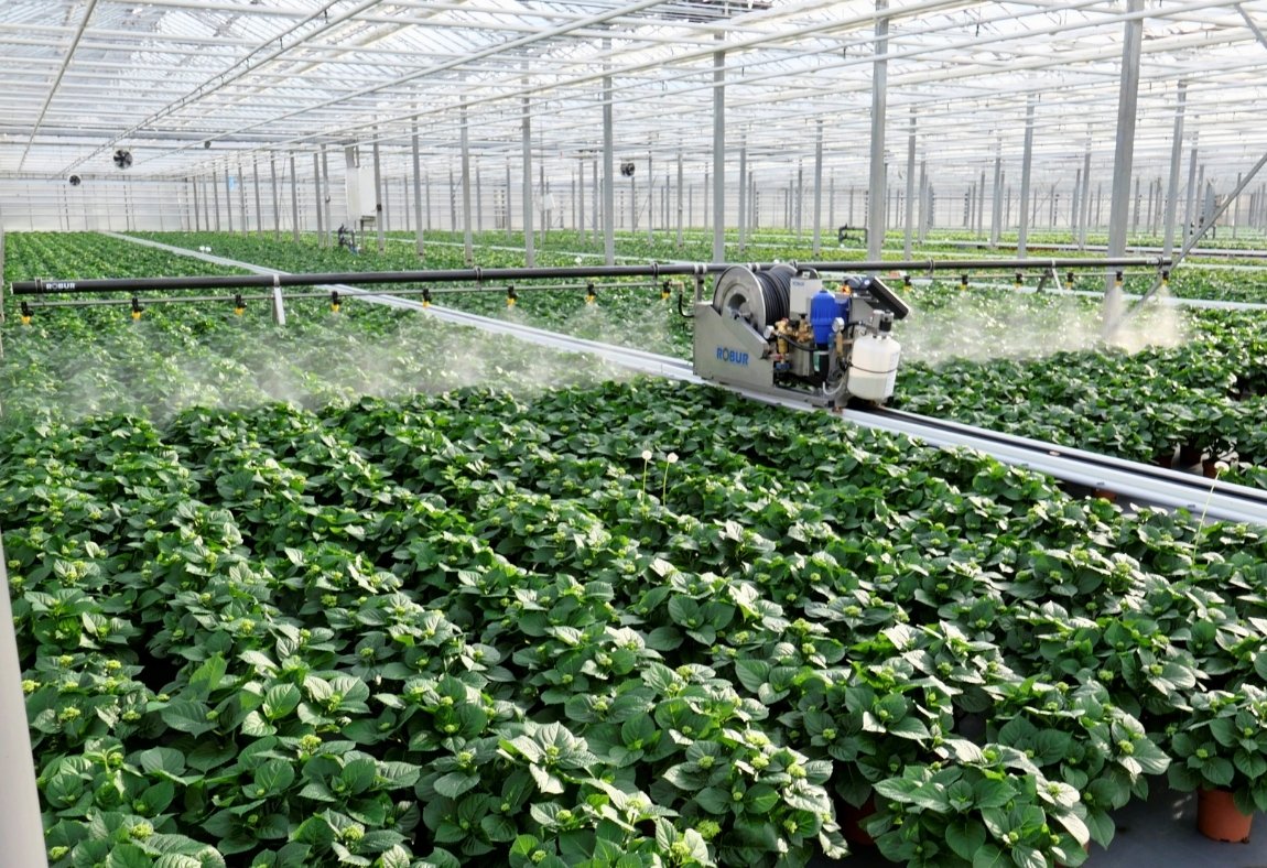 Going forward crop protection has become a whole lot easier for The Mastergrowers in De Lier. The crop protection spay robot from Robur Holland drives over the WPS SmartFlo tracks spays the hydrangeas more evenly then before. Besides this the work became easier and faster. This is a prime example for WPS and Robur to combine forces and come to a good handsfree solution for growers.